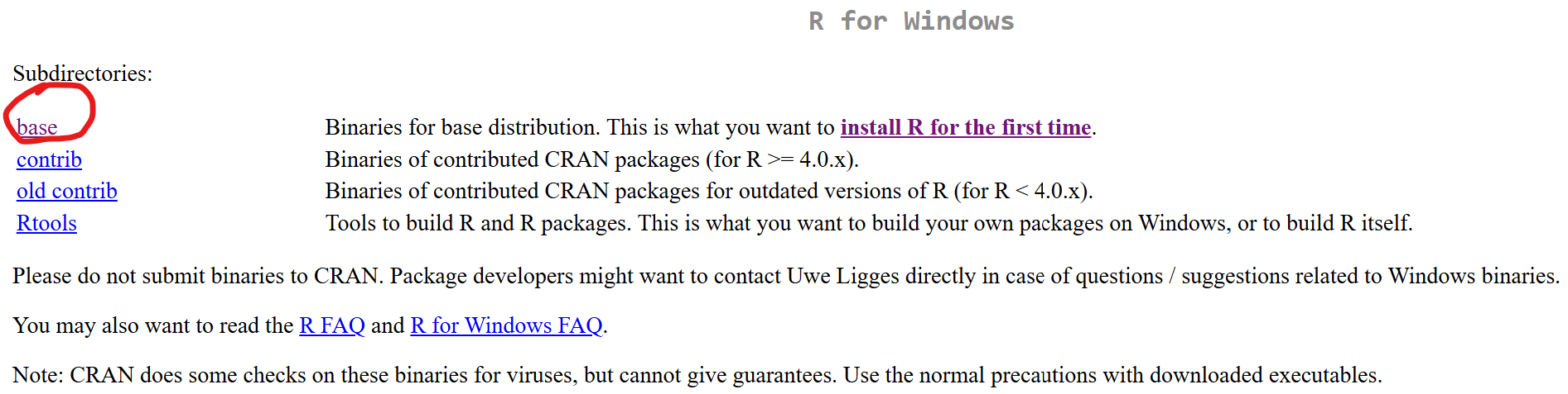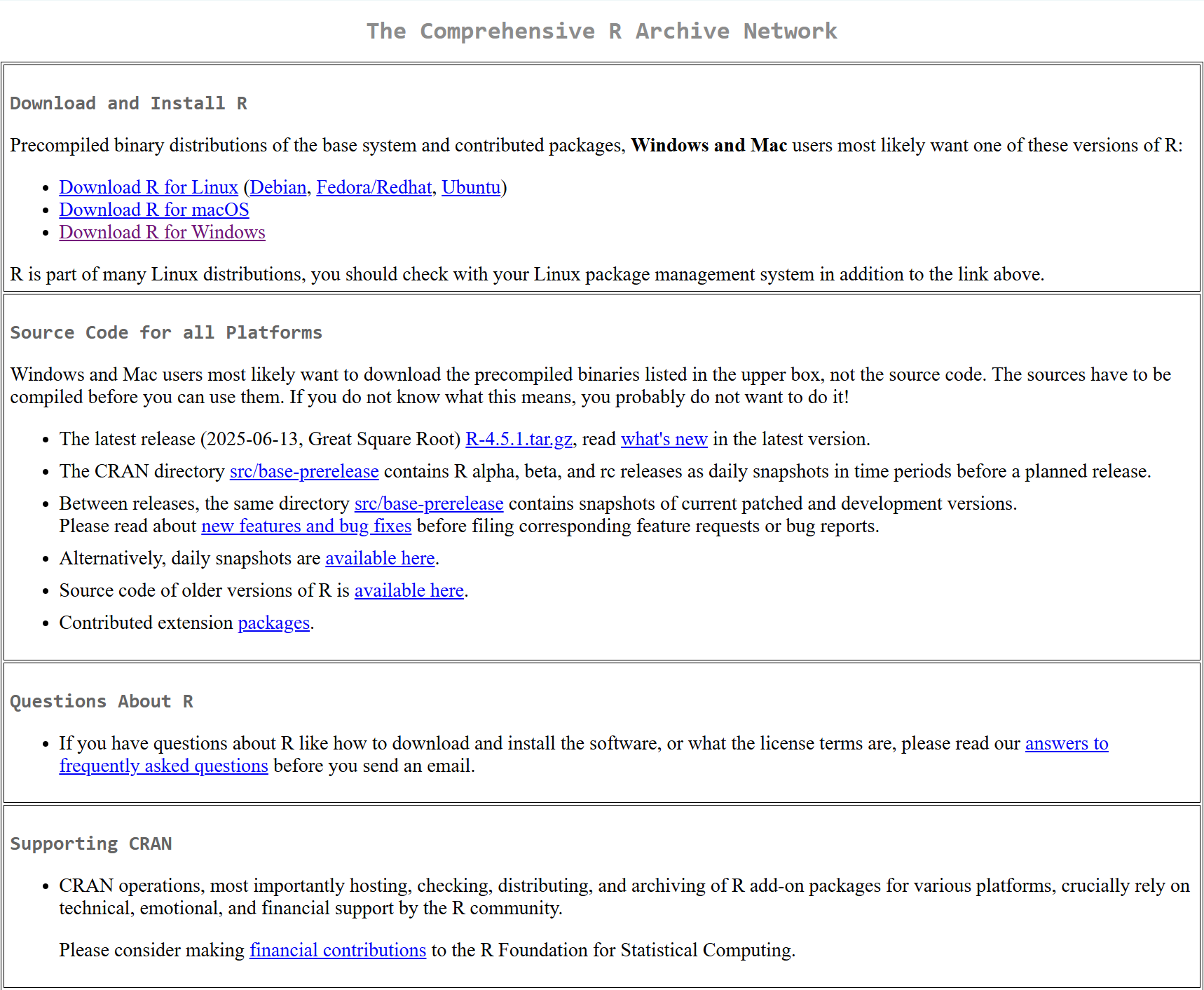 ⚠️ Please know that the following guide is for Windows users. If you are macOS users, please know that installing R follows standard macOS installer process, only choosing macOS installer to download at the source page.