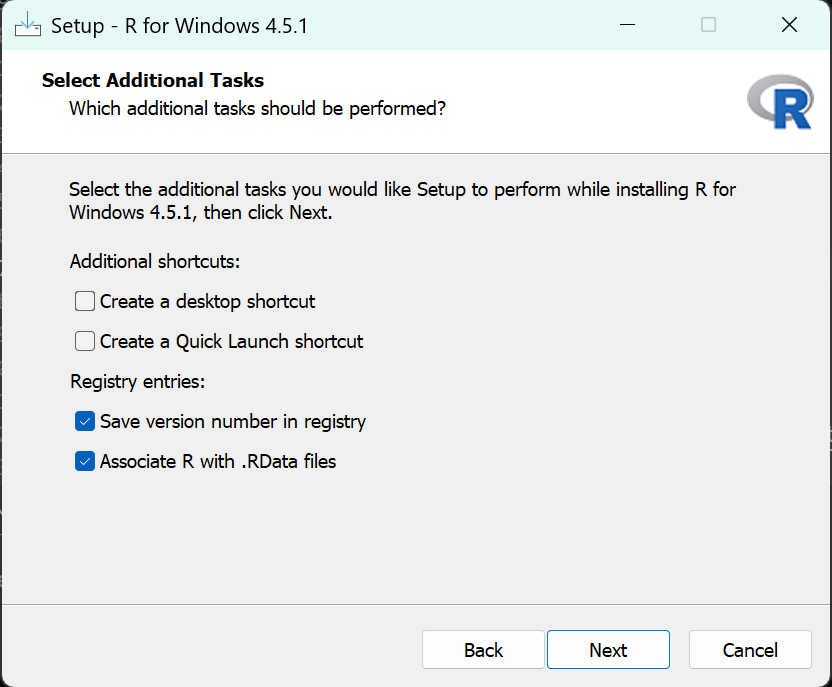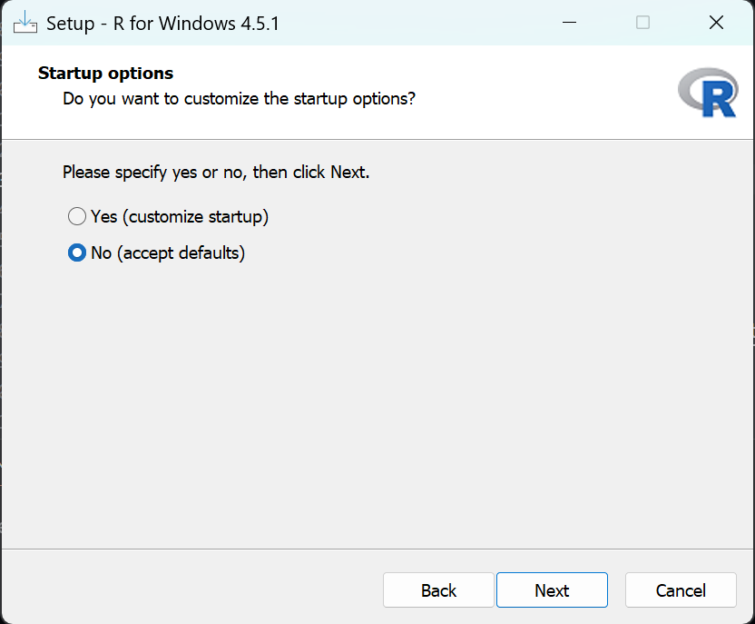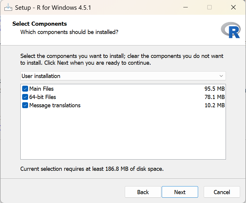 - Install R by following the installer instruction. You can keep all the default options and settings.