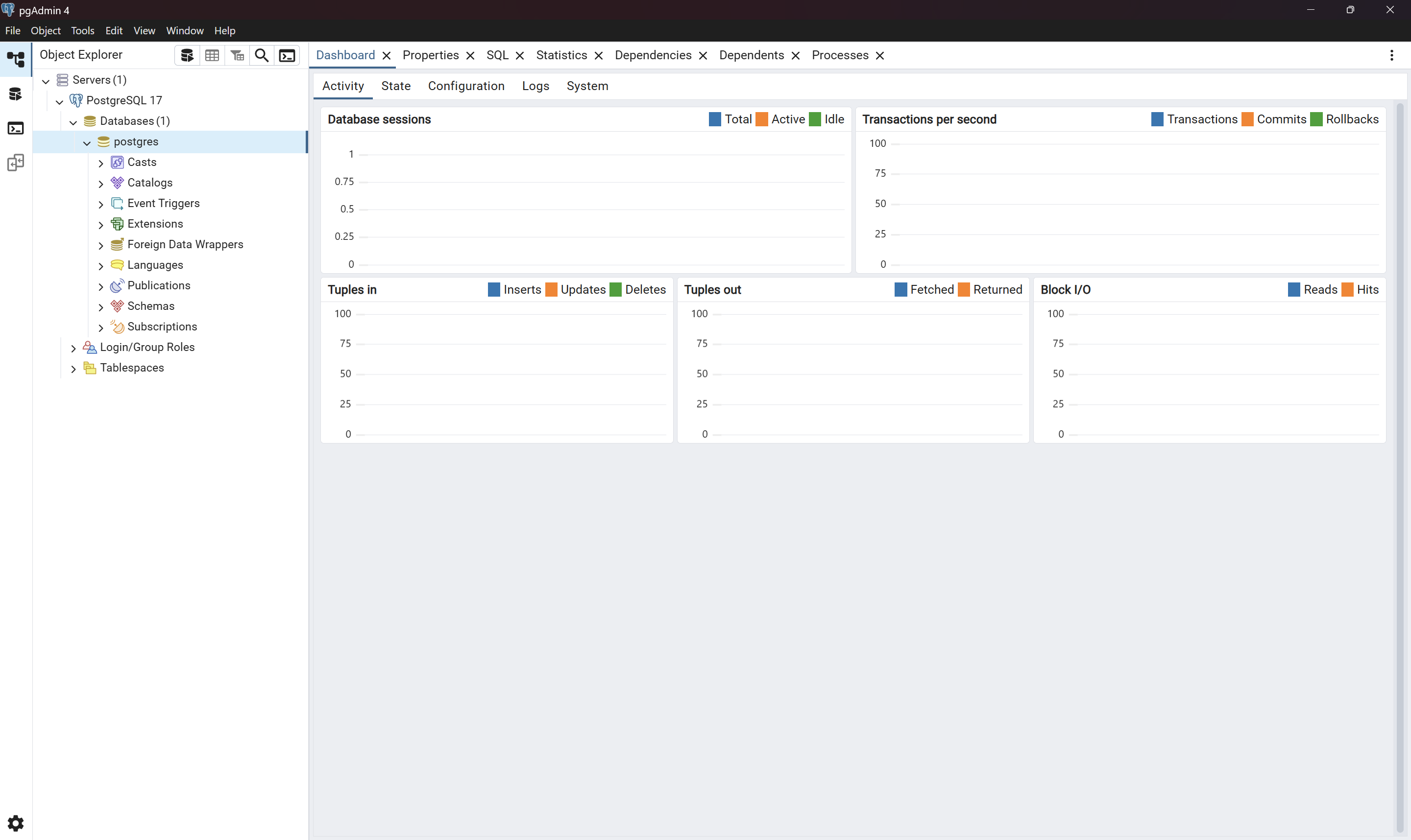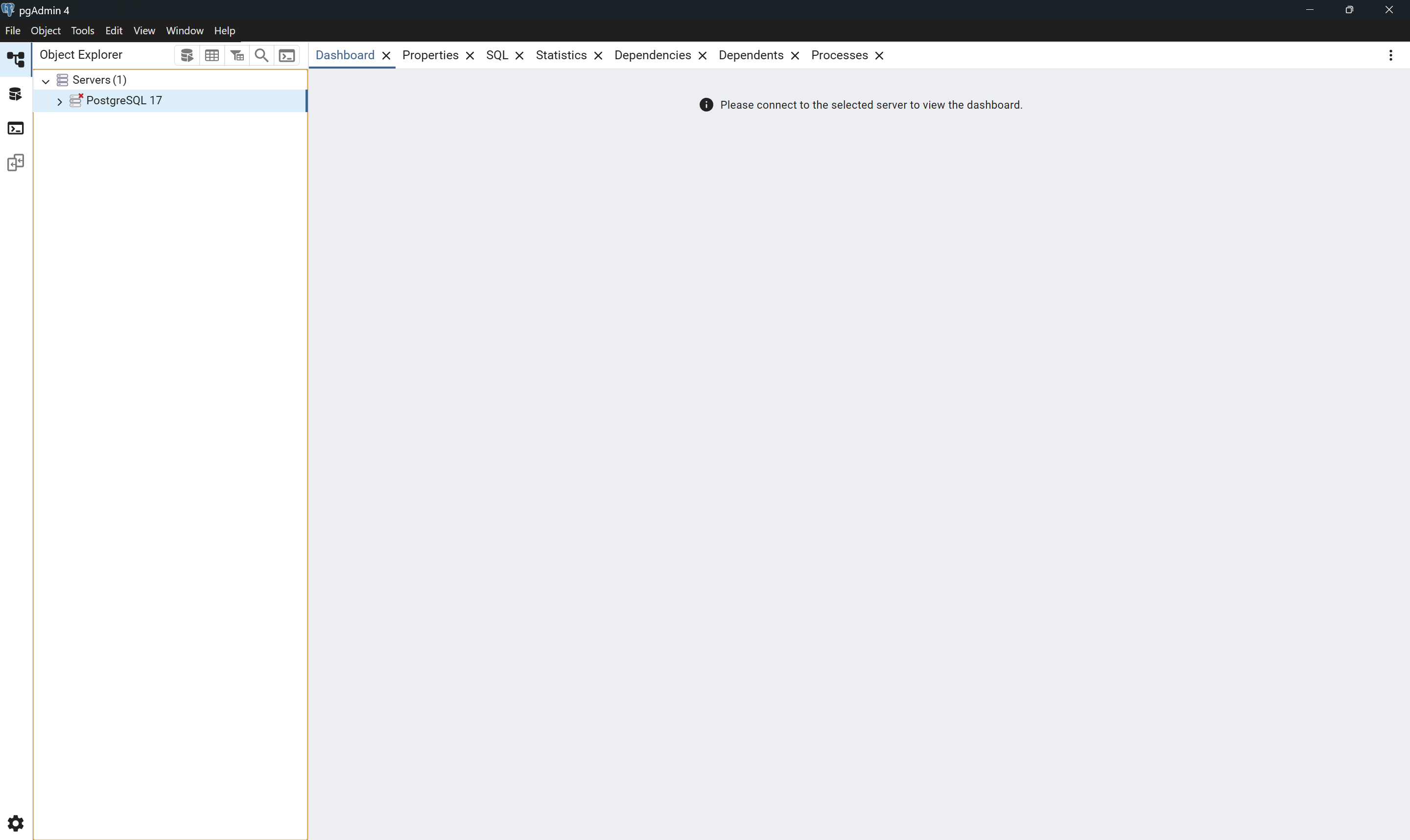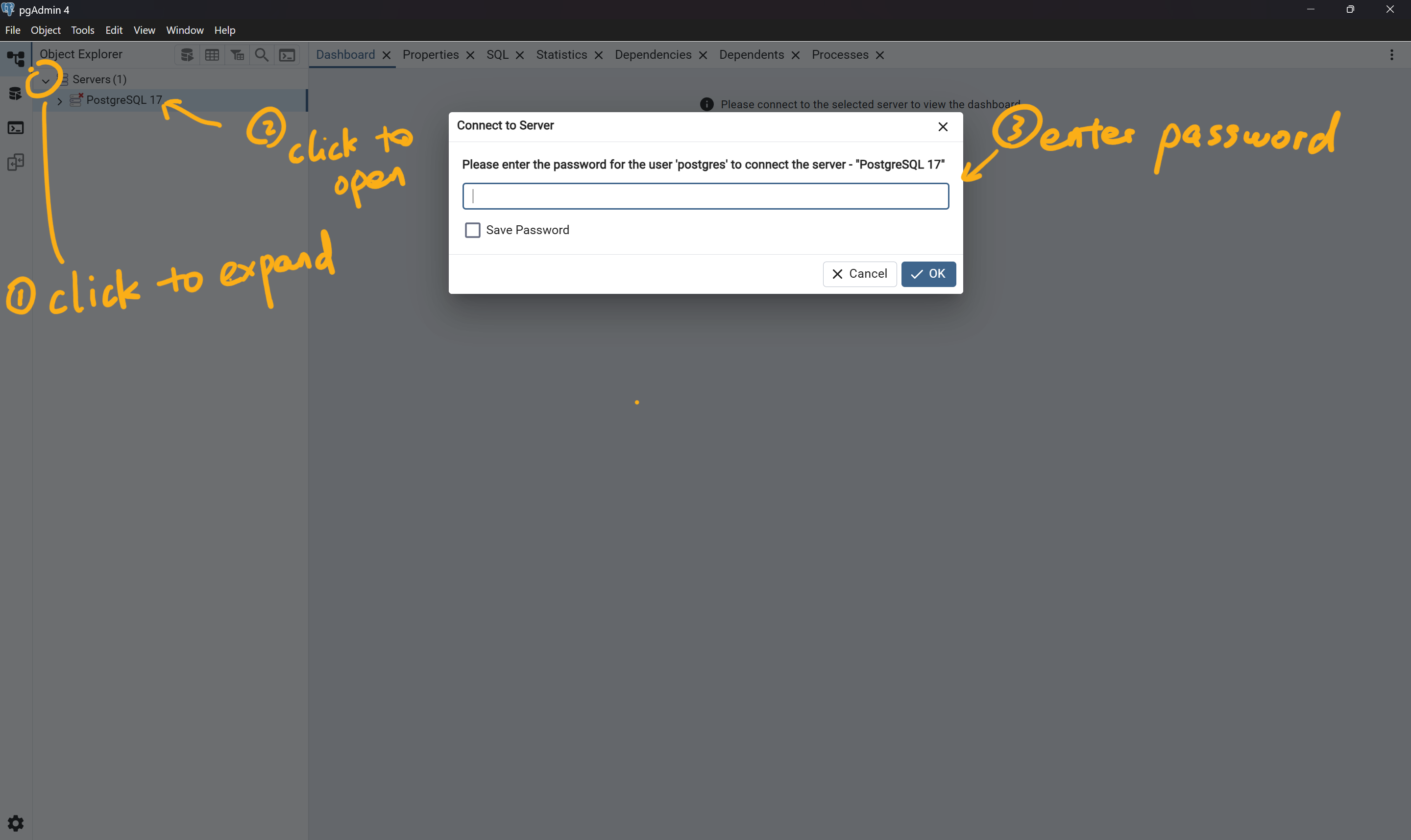 - Once admin tool is open, expand on “Servers” list and open the default server, here it is called “PostgreSQL 17”. You will be prompted to enter the same password (PostSQL1234) that we setup earlier.
