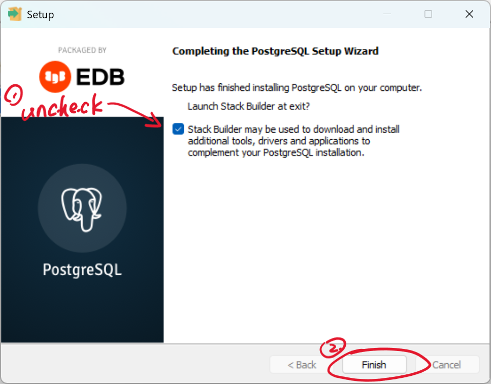 - When installation completed, make sure to uncheck the Stack Builder and then hit the finish button to exit.