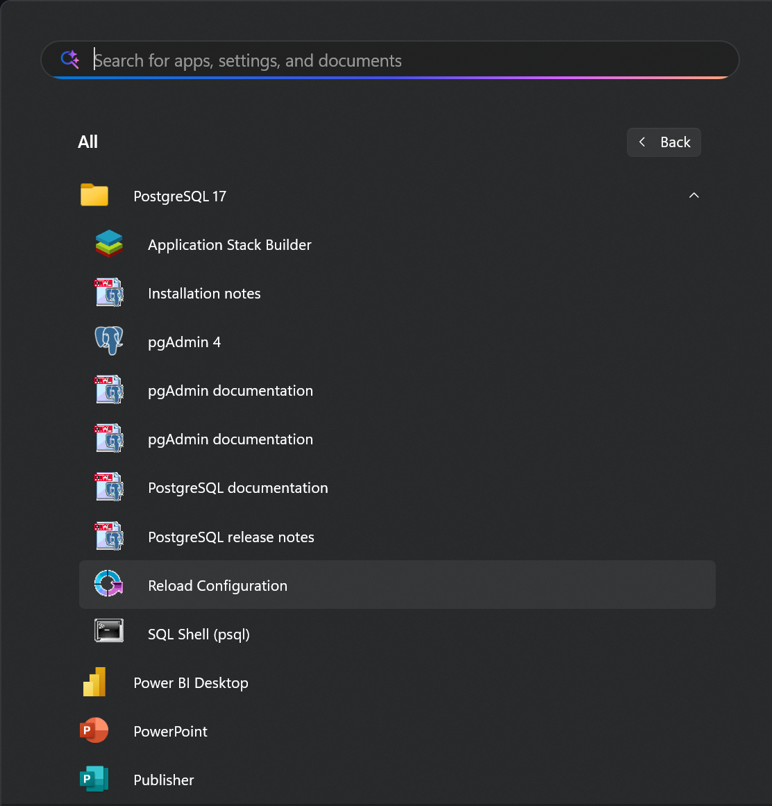 - In the Startup Meanu, locate and launch the admin tool called “pgAdmin4”